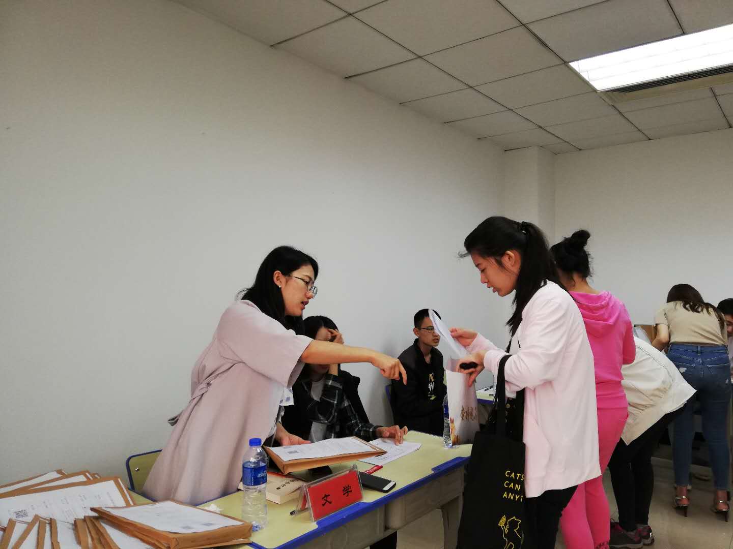 “档案袋上面的白色小纸条是学号、邮箱、密码等信息,注意看一下”“一卡通可以去莘子园或者湖畔餐厅的圈存机上去充值”“同学,你的身份证复印件我帮你贴吧”,担心同学们错过相关通知,还不忘提醒大家扫描档案袋上的《文传天下》和新生QQ群的二维码,以便及时查看相关的通知和各种信息。同学们进进出出,在“谢谢师哥、师姐”的声音中,一位又一位同学报到成功。