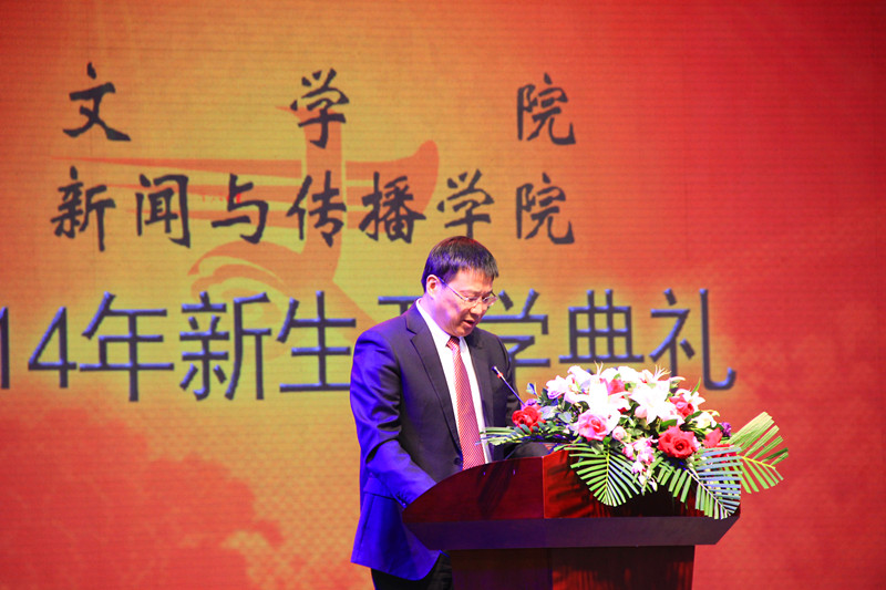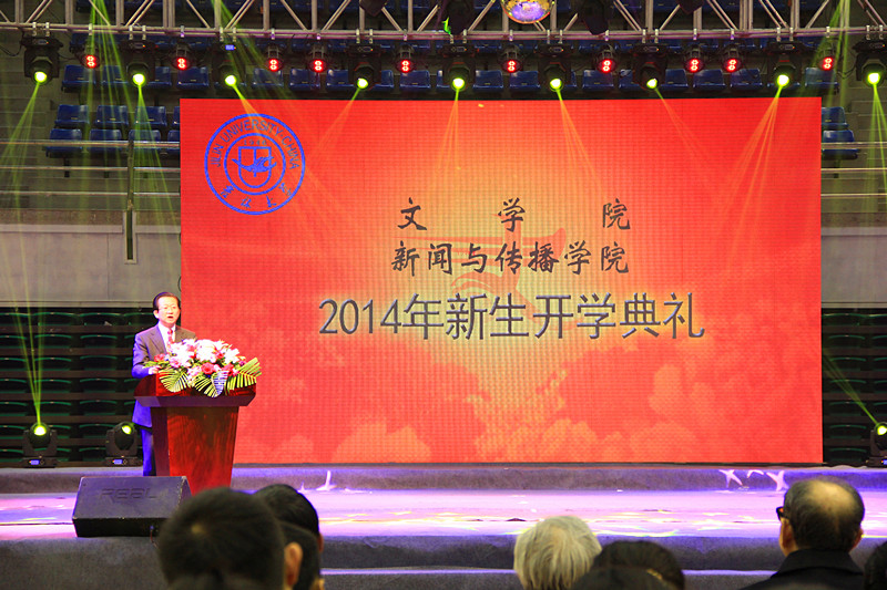 典礼开始后,全场师生及来宾庄严地唱响了国歌,文学院院长兼新闻与传播学院院长徐正考向新生致以热烈的欢迎,随后简单地介绍了学院的情况,同时提出几点希望:以宽广博大的胸怀对待身边人、身边事;学会独立思考问题,培养独立思维;强化安全意识,付出一定行动;培养自觉学习习惯,博览群书;尊重教学学术规范,严于律己。