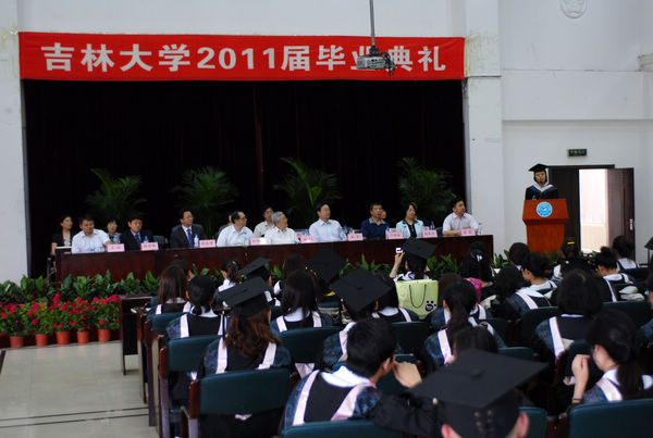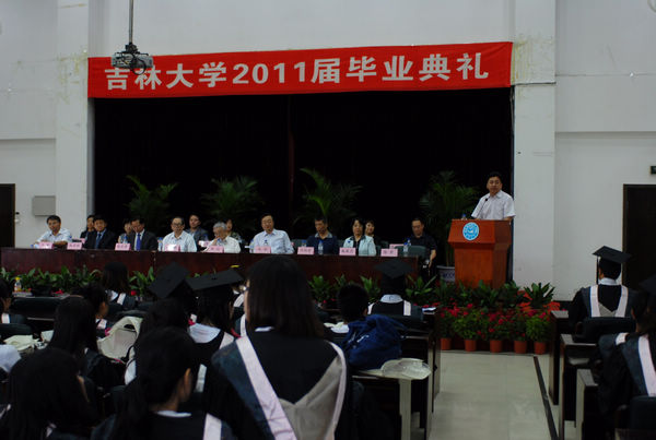 保送到北京大学免试攻读硕士学位研究生的中文系学生武宏琛代表毕业生发言,表达了毕业生们的心声——对于母校和老师的感恩之情,日后要回报母校、老师的坚定信心;教师代表许兆昌教授用真挚、朴素的话语表达了文学院全体师生对毕业生的祝福与祝愿,勉励他们努力学习,勤奋工作,多些社会良知和人文精神;文学院副院长赵宾福教授代表学院讲话,对2011届毕业生大学四年的学习生活和取得的成绩表示肯定,并献上殷切的寄语和厚重的嘱托,希望他们能够发扬求实创新、励志图强的吉大精神,将来回报母校、回报社会、报效祖国,并希望毕业生常回家看看。