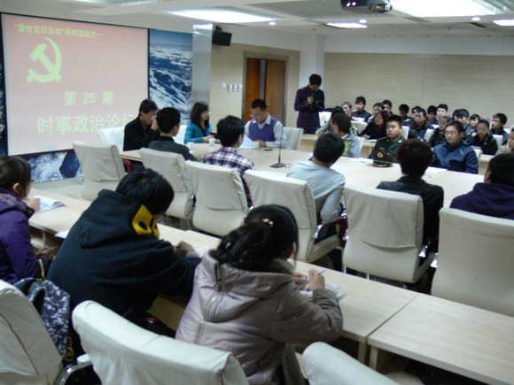 2010年11月18日,星空在线注册本科生党支部在东荣十楼会议室开展了“最佳党日”系列活动之——第25期时事政治论坛。参加此次论坛的有文学院党委副书记兼副院长刘卓、学生工作办公室主任冯子宸、2010级辅导员李沐曦,以及2007级第一党支部书记胡品、文学院团委副书记陈新阳,文学院学生会主席郭航、副主席孙越、张鑫扬、季峰,校学生会副主席李思逸,国防生模拟一连党支部书记马志文,社团联合会主席闫名驰、副主席勾文章等和文学院的学生党员。