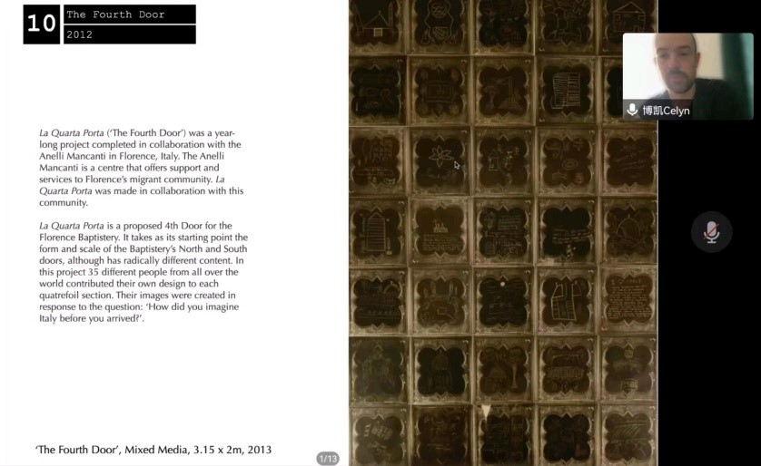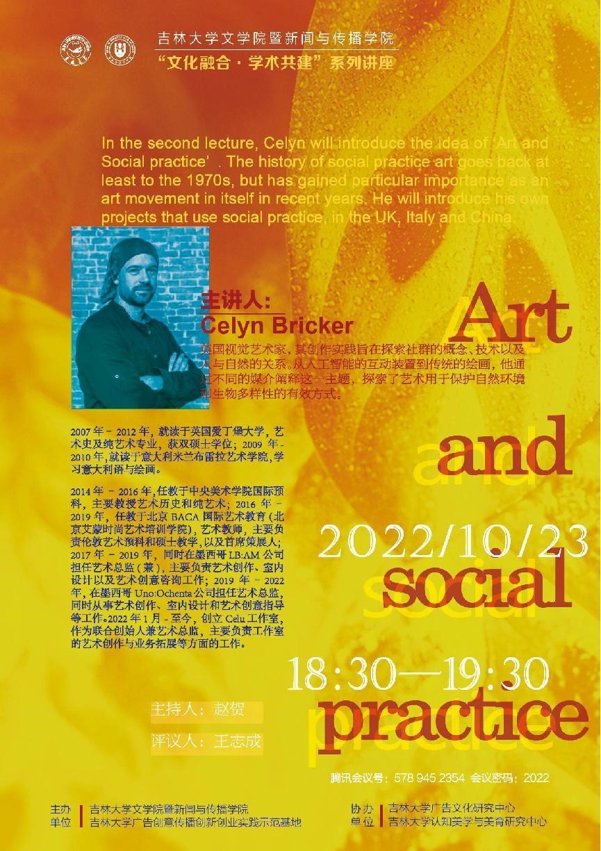 10月23日,由星空在线注册暨新闻与传播学院、星空在线注册广告创意传播创新创业实践基地主办,星空在线注册广告文化研究中心和星空在线注册认知美学与美育研究中心协办了第二期主题为“艺术和社会实践”的“文化融合·学术共建’’的英文学术讲座。本次讲座以线上形式进行,由传播系国际传播教研室主任赵贺副教授主持,创意传播设计教研室主任王志成老师评议。相关专业老师、在读本科生及硕士研究生共九十余人参与了此次活动。本期仍由英国视觉艺术家Celyn Bricker主讲。