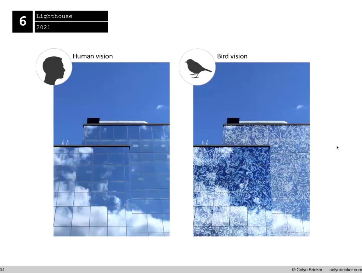 不仅如此,作为一位鸟类保护爱好者,Celyn在对鸟类因撞击高层玻璃而死亡现象的研究中又迸发出了新的艺术创意。他从鸟类对紫外线的感知这一视角出发,用透明的紫外线反射涂料进行创作,并覆盖高层建筑物的玻璃以防鸟类的撞击。期间,他还受到上海恒隆广场的邀请,将人眼可见图案与人眼不可见的紫外线图案结合起来,创作了一个防鸟撞建筑。Celyn特别强调,这件作品既是与都市生活者们的一种沟通,也是防止鸟撞的有力尝试。更重要的是,他希望这栋位于上海市中心的商业建筑可以触及更多的市民与游客,发挥更广泛的启示作用。