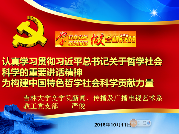 支部书记严俊在上党课时,全面讲解了《习近平总书记在哲学社会科学工作座谈会上的讲话》的主要内容,并且谈了自己的学习体会。他认为,习近平总书记在哲学社会科学工作座谈会上的重要讲话,是新形势下繁荣发展我国哲学社会科学事业的纲领性文献,为新时期高校哲学社会科学工作指明了方向。严俊就学习、贯彻习近平讲话精神提出了具体要求:一、将深入学习、贯彻习近平总书记关于哲学社会科学的重要讲话作为“两学一做”学习教育的重要内容和今后长期的政治任务,深入学习,认真领会,学深学透,真学真做。二、要自觉把马克思主义的立场、观点、方法贯彻到科研和教学工作当中,大力推进新闻传播学和广播电视艺术学学科体系与教材体系的创新,树立为人民做学问的理想,深化教育教学改革,全面落实立德树人的根本任务。三、以服务党和政府的决策为宗旨,以人民为中心,坚持问题导向,以改革创新为动力,述学立论,建言献策,发挥好哲学社会科学服务社会实践、人才培养、舆论引导等方面的重要功能。