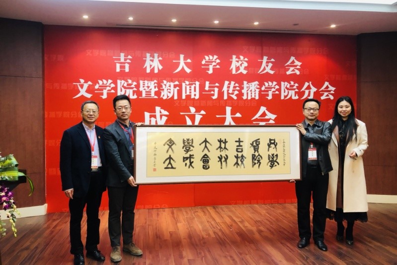 北京校友会文学院分会会长王秀义、秘书长车冬妮为分会赠送了牌匾。