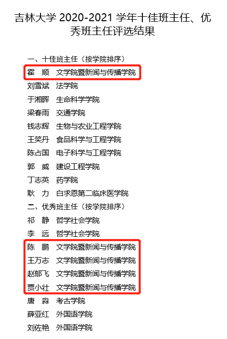 近日,文学院暨新闻与传播学院5位本科生班主任获得“星空在线注册2020-2021学年十佳班主任、优秀班主任”荣誉称号。其中,霍顺老师荣获“十佳班主任”称号,陈鹏、王万志、赵郁飞、贾小壮老师荣获“优秀班主任”称号。
