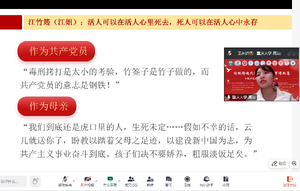 “红岩开红花,花开映彩霞”。重庆大学博雅学院研究生二支部,结合地域特色,以“红岩精神”为主题展开宣讲,通过挖掘“红岩精神”的内涵,回顾以江姐为代表的红岩故事,展现革命先烈艰辛的奋斗史,鼓舞和激励着党员同志不断攻坚克难,积极投身强国建设和民族复兴的伟大实践中。
