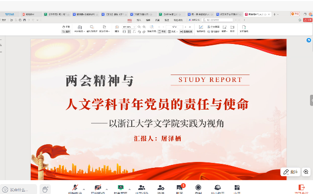 “两会鼓民心,踔厉奔鹏程”。浙江大学文学院本科生第二党支部的宣讲则将“两会精神”与“人文学科青年党员的责任与使命”相结合,更具时代特色,讲述了青年党员如何在“两会精神”的指导下,把握人文学科发展的新方向,如何以高度的政治责任感和历史使命感,推动人文学科的蓬勃发展。