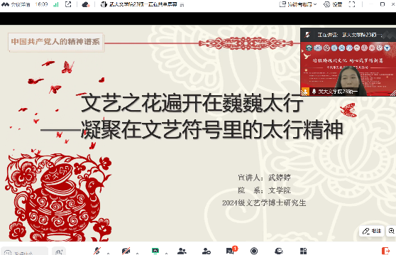 “群峰壁立太行头,天险黄河一望收”。武汉大学博士宣讲团结合专业特色,带来了“文艺之花遍开在巍巍太行——凝聚在文艺符号里的太行精神”的主题分享。通过讲述太行山区的文艺发展与太行精神的紧密联系,展示文艺如何成为传播太行精神的重要载体,以及太行精神如何在文艺的滋养下更加熠熠生辉,鼓励党员们从文艺与精神的融合中汲取力量,推动文化繁荣发展。