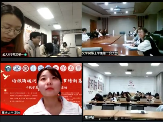 为激发党建活力,提升支部成员的凝聚力。2025年3月28日晚,我院博士学生第二支部参加了以“精神谱系传承”为主题的联合党日活动。该活动由武汉大学文学院支部和华中科技大学人文学院支部联合举办,并且以线上线下相结合的形式顺利开展。参加本次活动宣讲的还有重庆大学博雅学院研究生二支部、武汉大学博士生宣讲团和浙江大学文学院本科生第二党支部。参与旁听的支部分别是武汉大学文学院2023级硕士第一、第二、第三党支部和华中科技大学人文学院文学专业硕士生第一党支部。